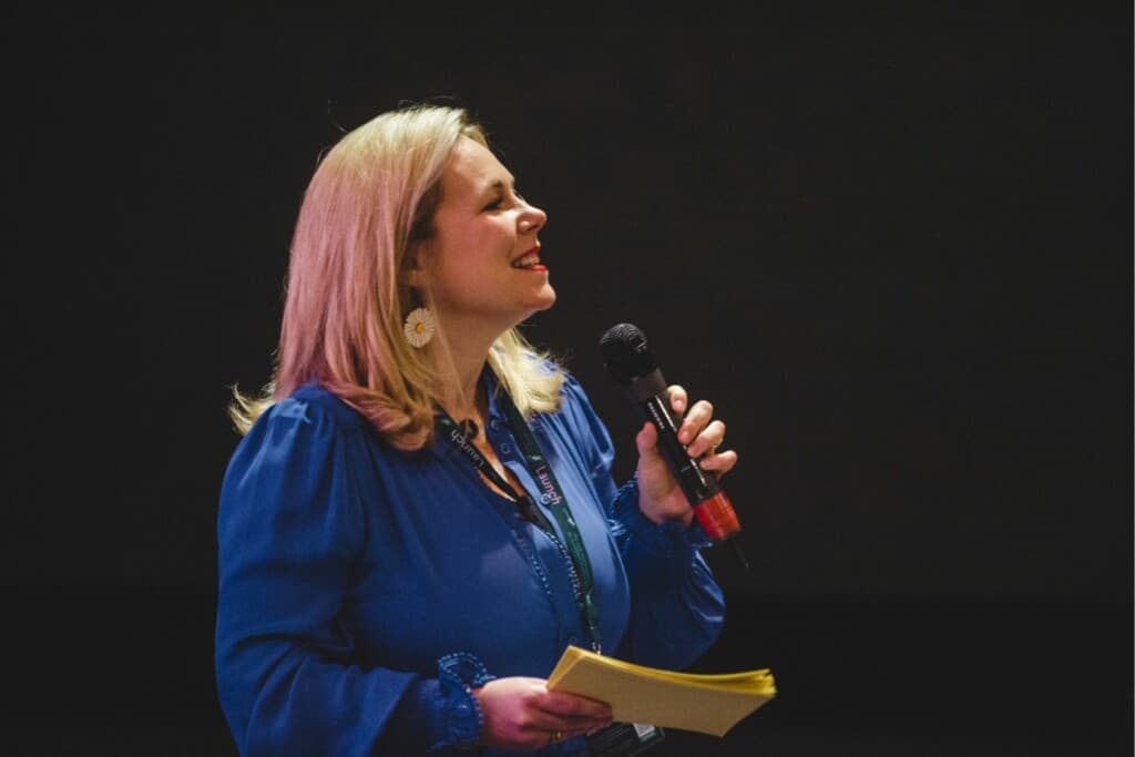 Woman speaking on stage at event holding microphone